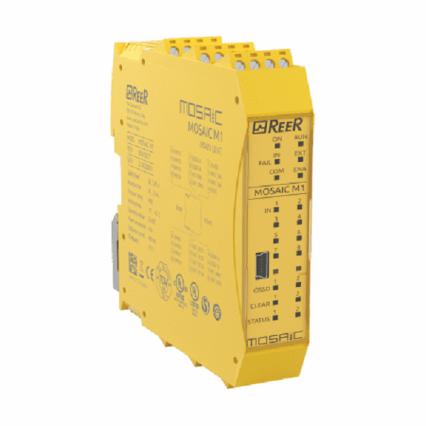 Como autônomo: para controlar máquinas menores conectando-se com até 4 dispositivos de segurança, isto é, 1 cortina de luz de segurança, 1 parada de emergência, 1 sensor magnético e 1 interruptor bi-manual.