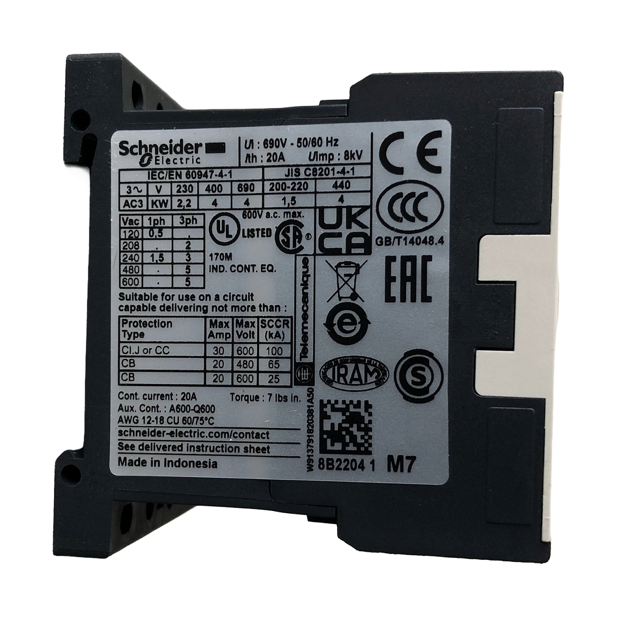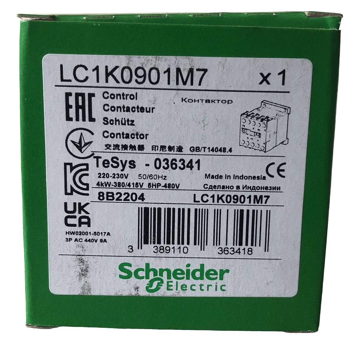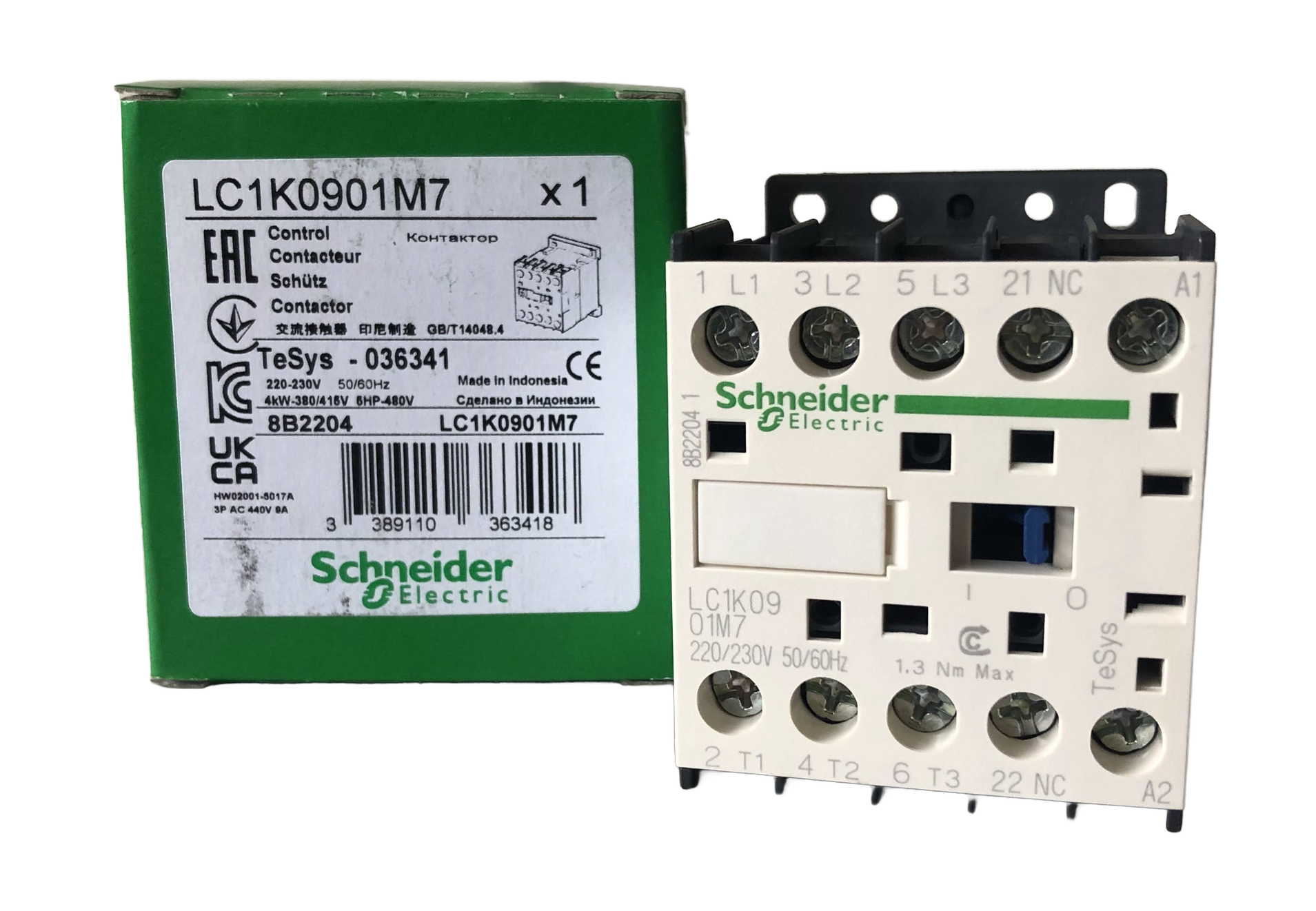 Contator TeSys K, 3 polos (3NA), para aplicações de controle de motores até 9A/690V AC-3 (4kW@400V), e para aplicações de controle de carga não indutiva até 20A/690V AC-1. Fornece uma bobina de 220V 50/60Hz CA, contato auxiliar embutido 1NF, conexão por terminais de grampo de parafuso. Para taxas de operação de até 600 ciclos/hora e ambientes de até 50°C, proporciona confiabilidade e durabilidade para aplicações padrão. Muito compacto (largura de 45 mm), montagem em trilho DIN ou fixação por parafuso. Certificação multipadrões (IEC, UL, CSA, CCC, EAC), compatível com Green Premium (RoHS/REACh).