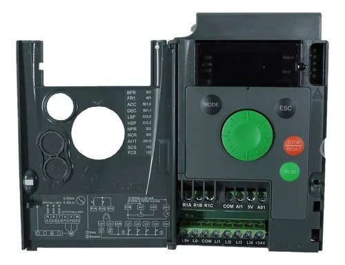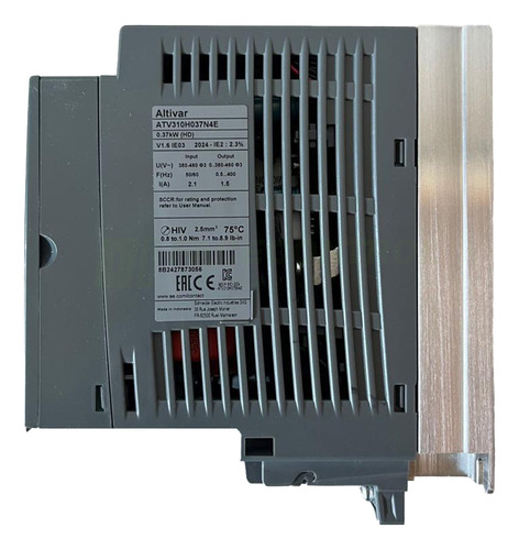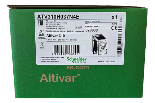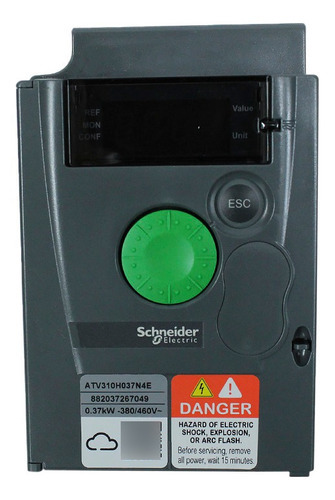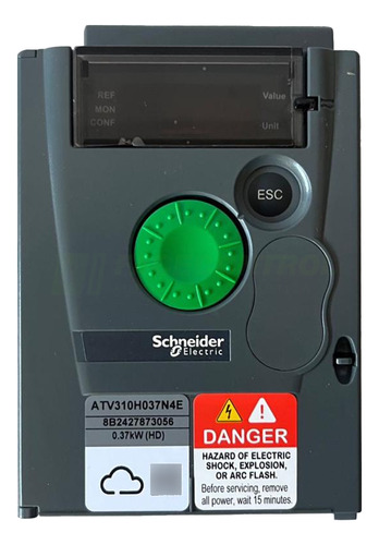 Inversor de Frequência ATV310 0,5CV 1,5A 380v – Modelo: ATV310H037N4E O variador de velocidade / inversor de frequência (VSD) da Schneider Electric Altivar Easy 310 pode alimentar motores assíncronos trifásicos até uma potência nominal de 0,37 kW, 0,5 hp em 380 a 460Vac. Características Gerais do Produto: Modelo: ATV310H037N4E Aplicações: Máquinas Simples Corrente de Saída: 1,5A Contínua Corrente Máxima de Saída: 2,3 A por 60 segundos. Display: 04 dígitos LED Entradas Analógicas: 1;Corrente configurável: 0..20 mA ; Tensão configurável: 0..10 V ;Tensão configurável 0..0,5 V Entradas Digitais: 4 ; Programável PNP/NPN LI1…LI4 24 V 18..0,30 V Fabricante: Schneider Fases de Entrada: Trifásico Grau de Proteção: IP20 sem placa de vedação na parte superior; IP41 topo Linha: Altivar Easy 310 Peso: Aproximadamente 0,700kg Potência: 0,5 CV Dimensões: 130x72x143mm (AxLxP) Modo de Controle: Controle vetorial sem feedback ;Controle vetorial sem feedback ; V/F Saída Analógica: 1;Tensão configurável através de software: 0..10V ;Corrente configurável através de software: 0..20mA Saída Digital: 2; Saída lógica LO+, LO;Rele de saida protegido R1A, R1B, R1C 1 F/A Tensão de Saída: 380…460 V – Trifásico Tipo de Proteção: Sobretensão; Subtensão; Sobrecorrente ; Sobreaquecimento ; Curto-circuito entre fases do motor ; Perda de fase de entrada ; Proteção termica do motor via calculo de I²t Acompanha o produto: 01 – Inversor de Frequência ATV310H037N4E 01 – Manual do Usuário